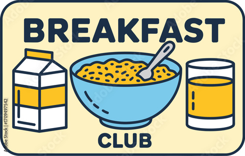 A cartoon illustration of a breakfast club logo with cereal, milk, and juice on a light yellow background
