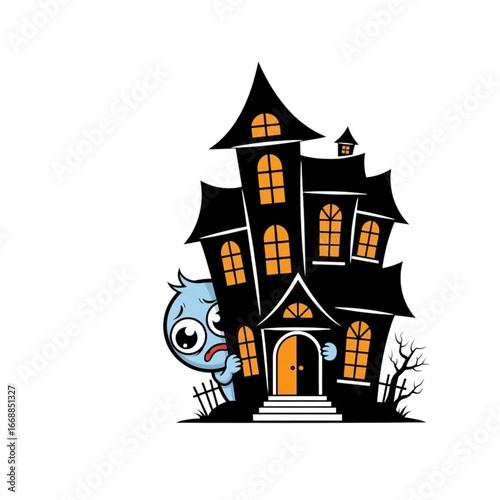 A cartoon illustration of a scared blue monster peeking from behind a haunted house on transparent background