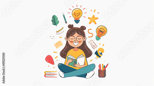 A cartoon illustration with a white background. A girl student is sitting, happily contemplating new ideas. There is blank space provided for writing text