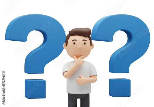 A cartoon man is thinking with question marks around him, representing doubt and uncertainty isolated on transparent background