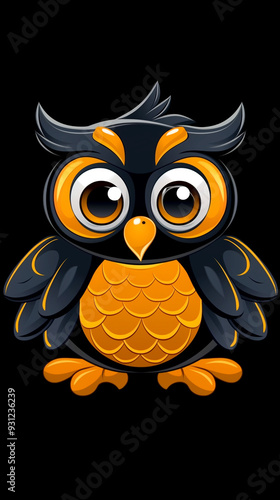 A cartoon owl with orange feathers and black eyes. The owl has a cute and friendly expression