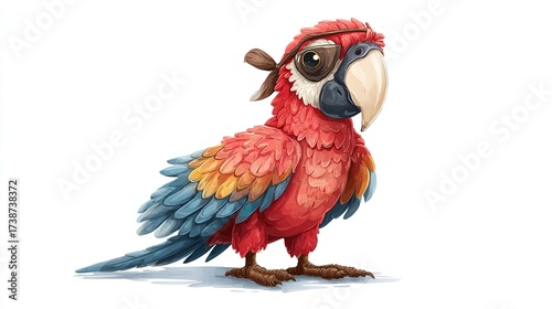 A cartoon parrot, red/blue/yellow, with an eyepatch, brown ribbon, white background. Detailed