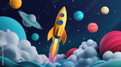 A cartoon rocket soars into space accompanied by vibrant planets and fluffy clouds capturing the essence of dreams adventure and fresh starts