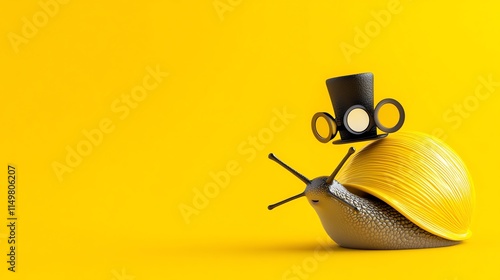 A cartoon snail wearing a top hat and goggles is on a yellow background.