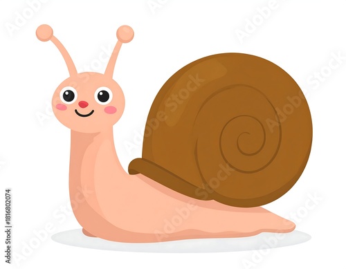 A cartoon snail with a cute face, antennae, and a brown shell, placed against a white background