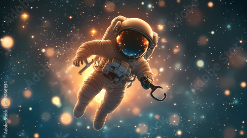 A cartoonish astronaut floating in space, holding a wrench amidst sparkling stars. Shadowfire Summoners. Illustration