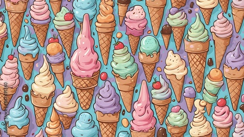 A cartoonish ice cream pattern with many different flavors