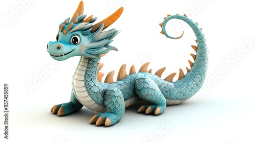 A cartoon-style blue and green dragon with orange horns and a curled tail, against a white background.