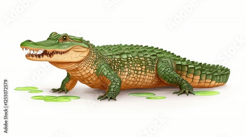 A cartoon-style crocodile with a textured green body, prominent teeth, and a playful posture, set against a simple white background.