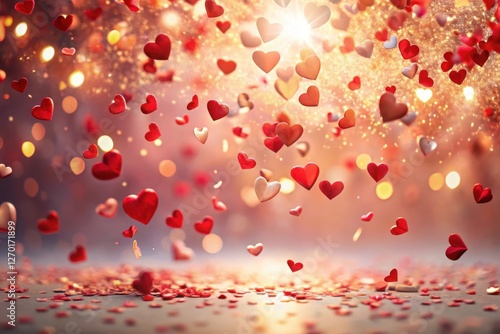 A cascade of romantic hearts, sparkling with festive lights, gently falls onto a bed of confetti, creating a magical and enchanting scene of love and celebration