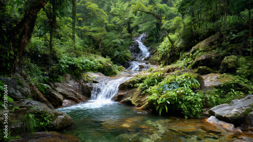 A cascading waterfall flows through a tropical forest, surrounded by lush greenery