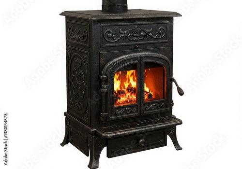 A cast iron wood burning stove with a fire burning inside on a white background studio shot