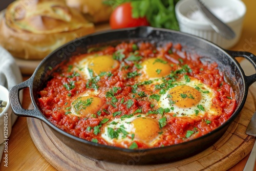 A cast-iron pan with shakshuka, egg and fresh herbs on a wooden table, AI generated, AI generated