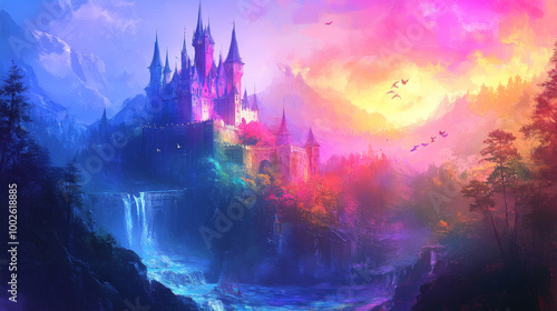 A castle painted in vibrant colors, like a magical place from a fairytale.