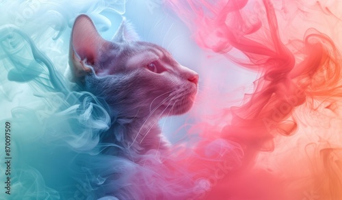 A cat is in a colorful cloud of smoke with its eyes closed. AI.