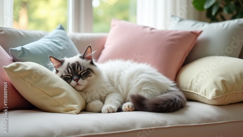A cat napping peacefully on a plush couch, with a calm and serene expression, surrounded by soft cushions