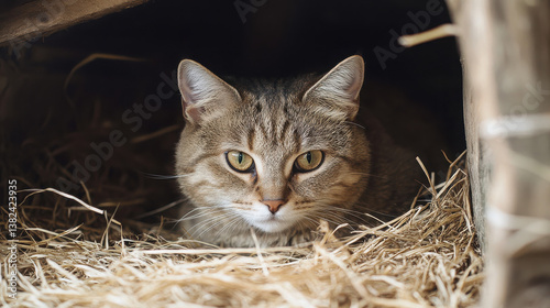 A cat resting in a cozy, straw-filled space, showcasing its alert expression.