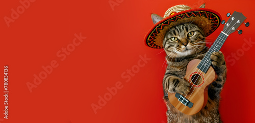 A cat sporting a sombrero and playing a guitar on a vibrant red backdrop for Cinco de Mayo