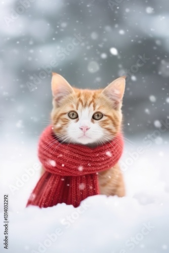 A Cat Wearing a Red Scarf in a Snowy Winter Wonderland