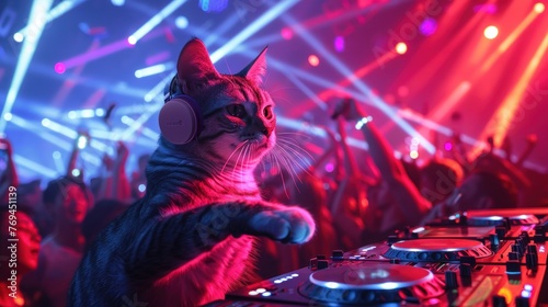 A cat wearing headphones spins a track while playing a track disc as a DJ in a pub.
