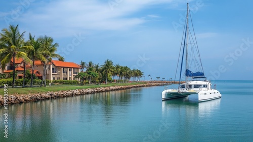 A catamaran moored at a tropical marina with palm trees swaying in the breeze