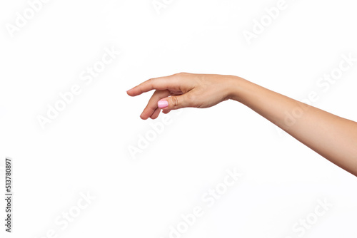 A caucasian female outstretched hand makes a gesture seems to click, point or touch something with the index finger isolated on a white background. Mockup with empty copy space for a intended object