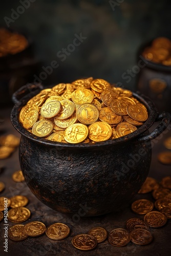 A cauldron filled with shiny gold coins, symbolizing wealth, prosperity, and hidden treasures in a mystical setting.