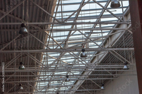 a ceiling in a production hall with a large svent window and luminaires suspended on long rods