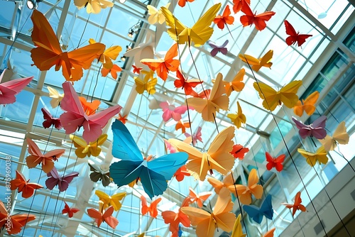A ceiling with large, suspended paper butterflies in various colors, adding a touch of whimsy.