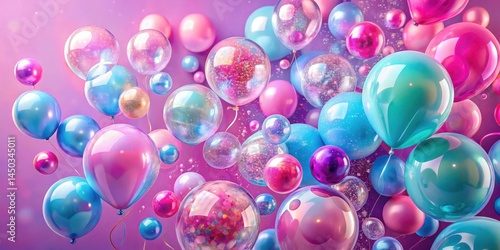 A celebration of vibrant iridescent balloons, each with a unique shimmer and sparkle, floating in a whimsical dreamscape of pastel colors and ethereal glitter.