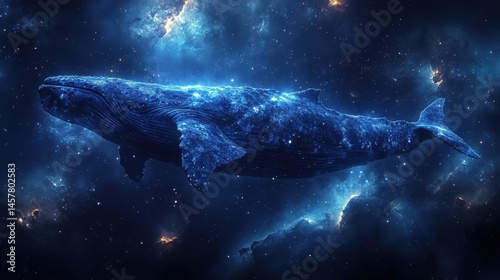A celestial blue whale swims through a cosmic sea filled with stars and nebula formations.
