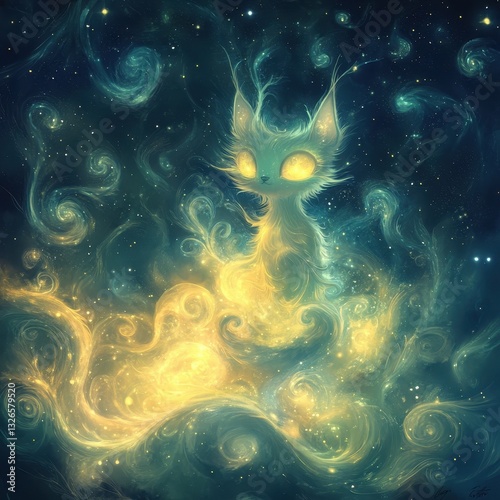 A celestial cat creature floats in a sparkling cosmic landscape