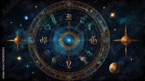 A celestial compass with zodiac signs on a dark blue background with stars and planets.