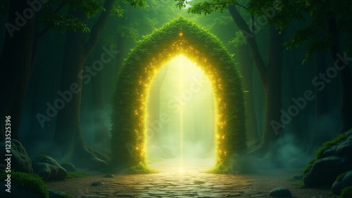 A celestial doorway of glowing leaves, symbolizing spiritual transformation, cosmic passage, and the bridge between worlds.