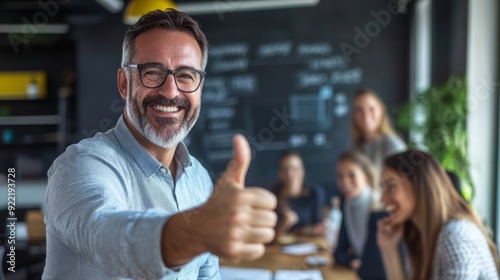 A CEO or Business manager giving a thumbs up, Congratulation concept with employee in a modern office, Happy teamwork members around, emphasizing positive feedback and encouragement.