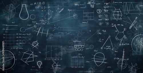 A chalkboard with a lot of math equations and diagrams. Scene is serious and focused, as it is a classroom or study space. The idea behind the image is to showcase the complexity