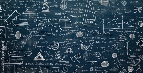 A chalkboard with a lot of math equations and diagrams. Scene is that of a classroom or a study space
