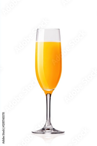 A champagne flute filled with vibrant orange juice stands on a minimalist surface. The bright color of the juice contrasts with the clear glass, creating an appealing presentation