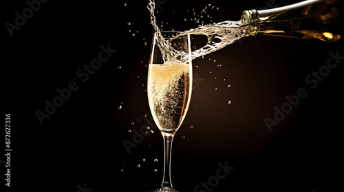 A champagne glass being filled with sparkling champagne, with bubbles rising and spraying