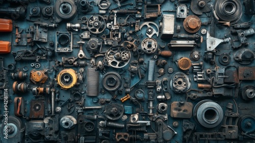 A chaotic arrangement of various metal parts and tools on a blue surface.
