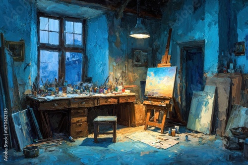 A Chaotic Artist Studio with Cluttered Tools and Colorful Canvases