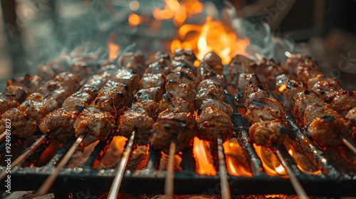 A charcoal grill with juicy shashlik cooking on skewers. The bright glow of the coals contrasts with the smoky, savory aroma of the grilling meat.