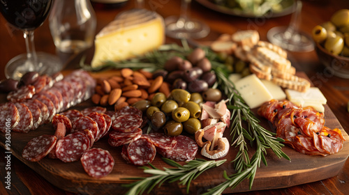 a charcuterie board, featuring a selection of cured meats, cheeses, olives, nuts, and sliced fruits, beautifully arranged on a wooden board with a few wine glasses in the background