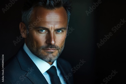 A charismatic man with salt and pepper hair, wearing a dark suit and tie, stares intensely into the camera.