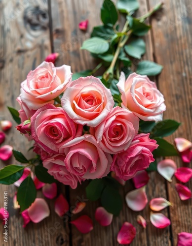 A charming bouquet of blooming roses with scattered petals on rustic wood, stock photo, bloom