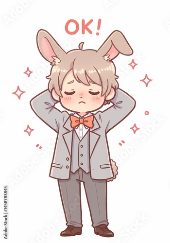 A charming cartoon depiction of a bunny character in a grey suit with an OK! text bubble, conveying a sense of acceptance, whimsical illustration, and cheerful