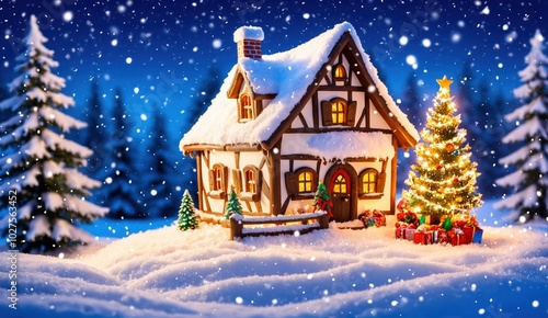 A charming Christmas scene showcasing a snow-covered house with warm lights and a brightly decorated tree. Snowflakes fall gently, creating a magical and peaceful holiday mood, perfect for Christmas
