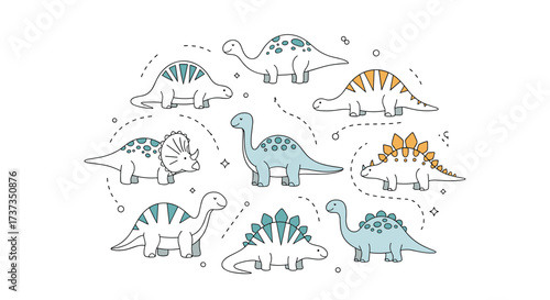 A charming circular arrangement of cute cartoon dinosaurs in pastel colors.