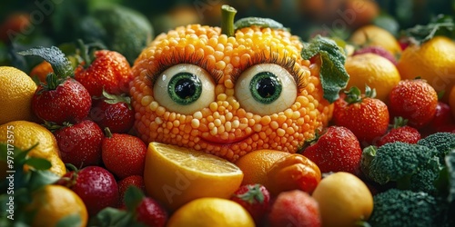 A charming cityscape where animated fruits and veggies create a playful and engaging environment
