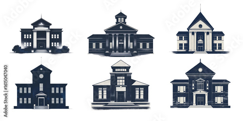 A charming collection of six distinct architectural illustrations, showcasing various styles of classic old school buildings, rendered with intricate details and a timeless, illustrative aesthetic